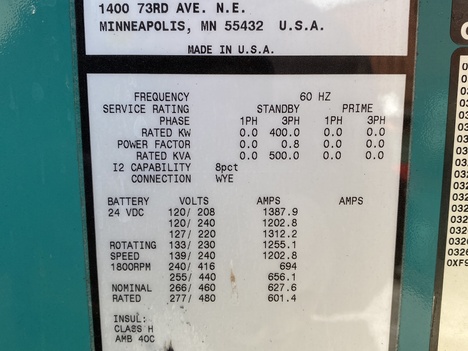 2003 Year Model Cummins / Onan 400KW Enclosed Generator on Double Wall Base Tank. 3 Phase, 60 HTZ, 1800 RPM, 695HP Cummins NTA-855-G5 Engine, 240/480 Reconnectable. Currently setting at 480VAC. Total Run Hours of 357 Hrs Since New. Cummins Command Auto Start / Stop Control Panel. Attached 800Amp Breaker. Call for additional details 620-255-8126.